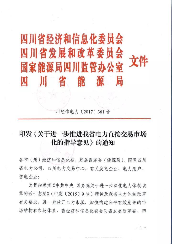 四川省經(jīng)信委、四川省發(fā)改委、國(guó)家能源局四川監(jiān)管辦、四川省能源局日前聯(lián)合下發(fā)了《關(guān)于進(jìn)一步推進(jìn)我省電力直接交易市場(chǎng)化的指導(dǎo)意見(jiàn)》。