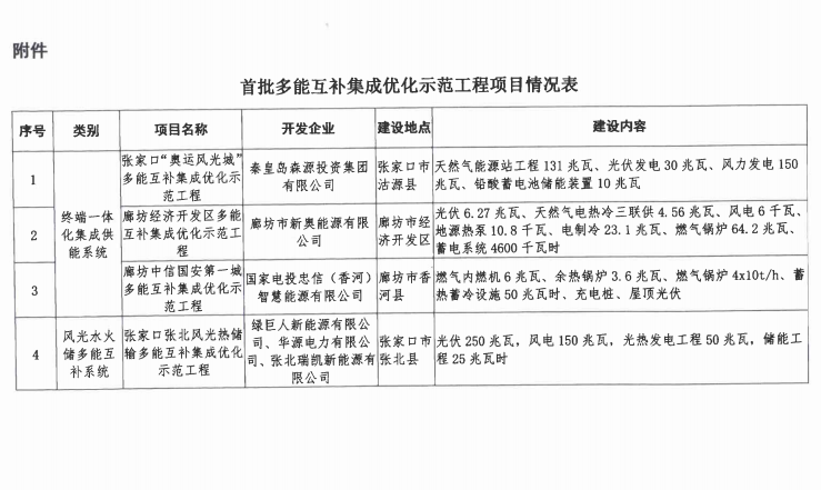 近日河北省發(fā)改委發(fā)布了《關(guān)于下達(dá)首批多能互補(bǔ)集成優(yōu)化示范工程建設(shè)規(guī)模的通知》,具體情況如下:
