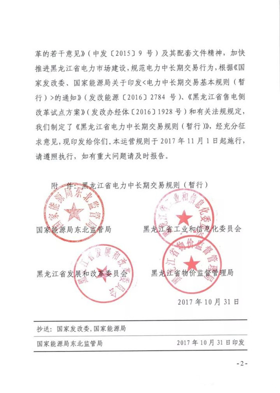 國家能源局東北監(jiān)管局、黑龍江省工信委、黑龍江省發(fā)改委、黑龍江省物價(jià)局日前聯(lián)合發(fā)布了《《黑龍江省電力中長期交易規(guī)則(暫行)的通知》,通知中稱,規(guī)則于2017年11月1日起施行。