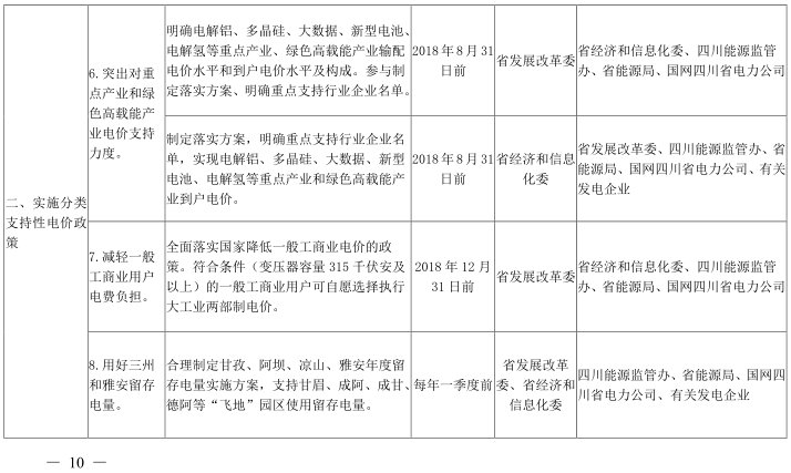 6.突出對重點(diǎn)產(chǎn)業(yè)和綠色高載能產(chǎn)業(yè)電價(jià)支持力度。對電解鋁、多晶硅保持現(xiàn)有輸配電價(jià)水平,到戶電價(jià)分別實(shí)現(xiàn)每千瓦時(shí)0.30元左右、0.40元左右水平;對大數(shù)據(jù)、新型電池、電解氫等綠色高載能產(chǎn)業(yè),輸配電價(jià)比照藏區(qū)留存電量輸配電價(jià)每千瓦時(shí)0.105元收取,到戶電價(jià)分別實(shí)現(xiàn)每千瓦時(shí)0.35元、0.35元、0.30元左右水平。