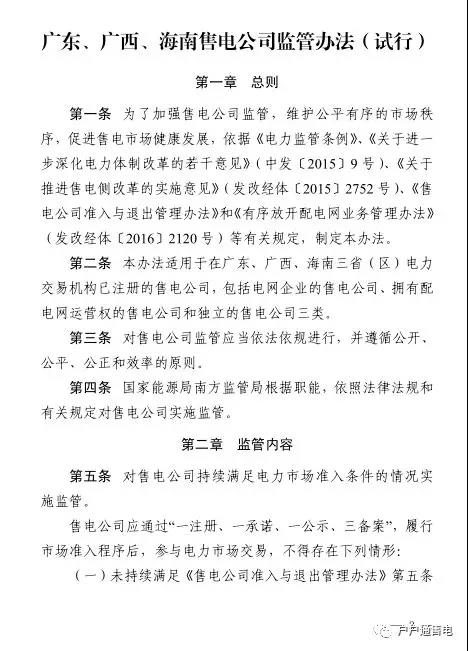 近日,南方能監(jiān)局印發(fā)《廣東、廣西、海南售電公司監(jiān)管辦法(試行)》的通知: