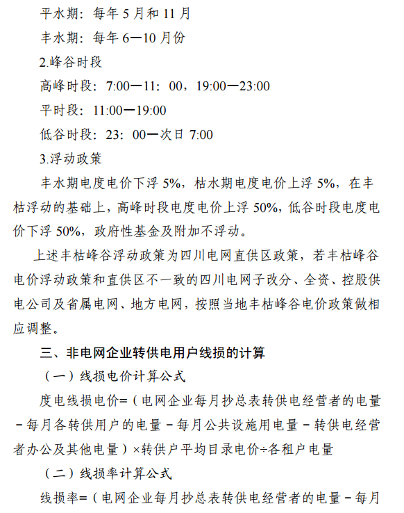 近日四川省發(fā)展和改革委員會(huì)發(fā)布了《關(guān)于清理規(guī)范非電網(wǎng)轉(zhuǎn)供電環(huán)節(jié)收費(fèi)有關(guān)事項(xiàng)的通知(征求意見稿)》,提出商業(yè)綜合體、產(chǎn)業(yè)園區(qū)、物業(yè)、寫字樓等轉(zhuǎn)供電經(jīng)營(yíng)者,應(yīng)按照轉(zhuǎn)供用戶每月電量,以及所公布的轉(zhuǎn)供電用戶電價(jià)和線損計(jì)算辦法(詳見附件),計(jì)算收取電費(fèi)。線損可計(jì)入物業(yè)管理費(fèi),也可隨電費(fèi)一并收取,其中:隨電費(fèi)收取的線損,線損率最高不應(yīng)超過 10%,且需在發(fā)票上單列表示,并至少每個(gè)季度向轉(zhuǎn)供電用戶公示一次計(jì)算過程。