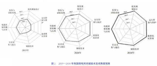 從技術(shù)上看,至2020年微網(wǎng)關(guān)鍵技術(shù)能夠基本支撐分布式可再生能源大規(guī)模推廣,至2030年微網(wǎng)技術(shù)能夠基本成熟,走向商業(yè)化,具體各技術(shù)方面發(fā)展預(yù)測如圖2所示。