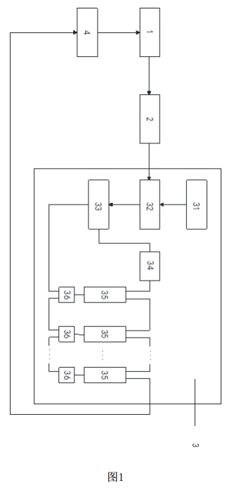 圖中:1-發(fā)電系統(tǒng),2-微電網(wǎng)中央控制單元,3-儲(chǔ)能系統(tǒng),31-能量管理系統(tǒng),32-儲(chǔ)能系統(tǒng)管理單元,33-電池組端監(jiān)測(cè)模塊,34-霍爾電流傳感器,35-儲(chǔ)能電池,36-電池在線監(jiān)測(cè)模塊,4-儲(chǔ)能變流器。