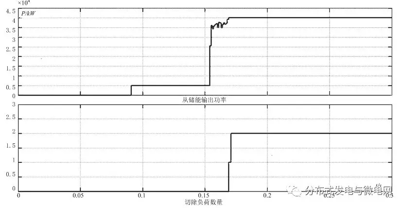 從圖6中可以看出,0.16s突增負荷后,由于主電源的輸出功率接近額定容量,影響了孤島微電網(wǎng)運行的可靠性,因此MGCC采取切負荷的策略,切負荷數(shù)量及從儲能的功率支持如圖7所示,從這兩張圖可知,整個控制過程較為平穩(wěn),可控負荷總量少了10kW,從儲能盡可能輸出最大功率以支持主電源,最終保持孤島微電網(wǎng)的穩(wěn)定運行。