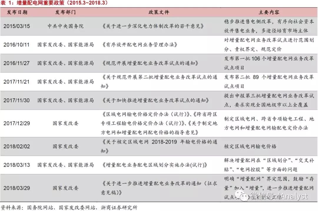 從2017年底至2018年3月“增量配電網(wǎng)”政策文件的密集出臺,我們可以觀察到國家積極推進(jìn)“電力體制改革”向著深化邁進(jìn)的堅(jiān)定決心。本次《關(guān)于進(jìn)一步推進(jìn)增量配電業(yè)務(wù)改革的通知(征求意見稿)》中繼續(xù)重申“加強(qiáng)對增量配電網(wǎng)接入公用電網(wǎng)管理”、“不得在接入環(huán)節(jié)設(shè)置障礙”,再次明確表達(dá)了不得對增量配電網(wǎng)進(jìn)行區(qū)別對待的指導(dǎo)精神;并明確了增量配網(wǎng)與公用電網(wǎng)“互聯(lián)互通”的平等地位;再加上“范圍界定”、“區(qū)域劃分”、“價格機(jī)制”等問題的不斷解決,增量配網(wǎng)試點(diǎn)項(xiàng)目加速落地可期。