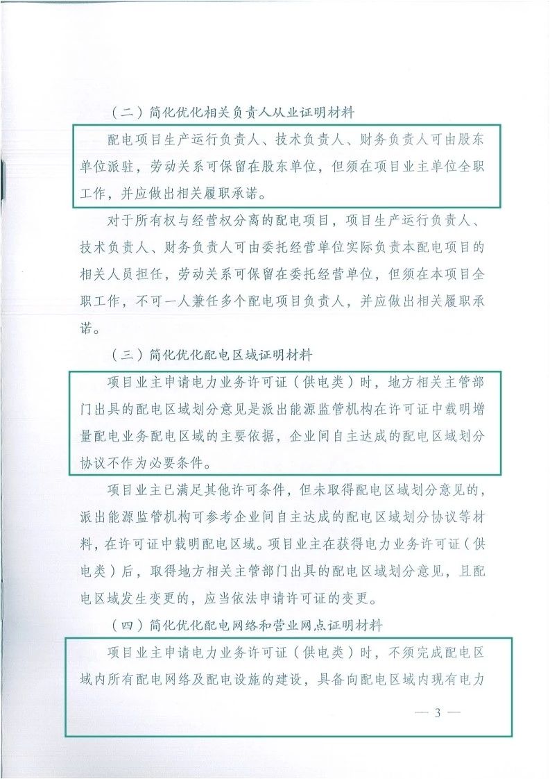 近日,國(guó)家能源局綜合司下發(fā)了一份《關(guān)于簡(jiǎn)化優(yōu)化許可條件、加快推進(jìn)增量配電項(xiàng)目電力業(yè)務(wù)許可工作的通知》文件,文件簡(jiǎn)化優(yōu)化了部分項(xiàng)目的許可條件以及申請(qǐng)材料,比如說(shuō)項(xiàng)目是在配電網(wǎng)改革放開前已經(jīng)投運(yùn)的項(xiàng)目,業(yè)主方已經(jīng)按照管理辦法提交申請(qǐng)并獲準(zhǔn)的,申請(qǐng)?jiān)S可證時(shí)就不需要提供相關(guān)材料;再比如有多個(gè)電壓等級(jí)的配電項(xiàng)目,只要提供最高電壓等級(jí)配網(wǎng)的核準(zhǔn)材料即可,就不需要提供在此之下的所有電壓等級(jí)核準(zhǔn)材料。