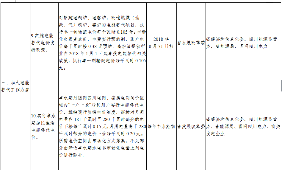 9.實(shí)施電能替代電價支持政策。對新建電鍋爐、電窯爐,改造燃煤(油、柴、氣)鍋爐、窯爐的電能替代項(xiàng)目,執(zhí)行單一制輸配電價每千瓦時0.105元;市場化交易完成前,電費(fèi)實(shí)行預(yù)結(jié)制,到戶電價每千瓦時按0.38元預(yù)結(jié)。高爐渣提鈦行業(yè)自2018年1月1日起享受電能替代相關(guān)政策,執(zhí)行單一制輸配電價每千瓦時0.105元。