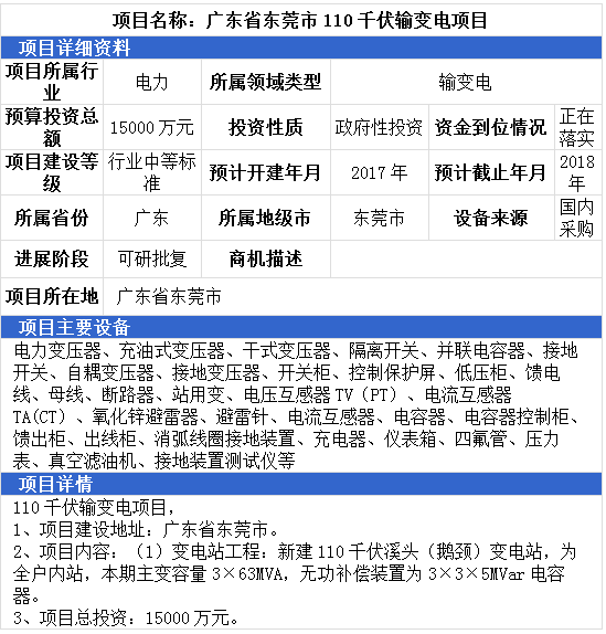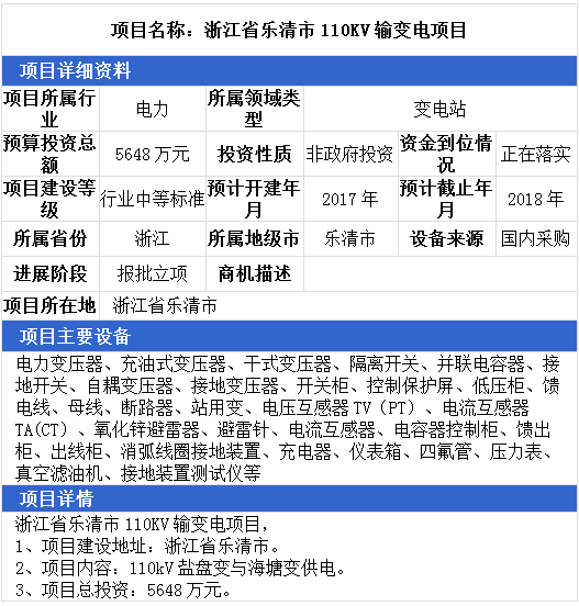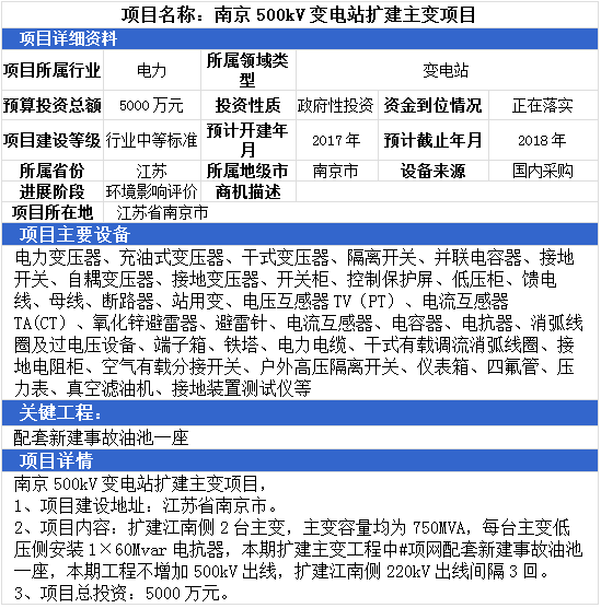 浙江省樂清市110KV輸變電項目、廣東省東莞市110千伏輸變電項目、南京500kV變電站擴建主變項目,最高項目總投資達15000萬元。項目主要設(shè)備有:電力變壓器、充油式變壓器、干式變壓器、隔離開關(guān)、并聯(lián)電容器、接地