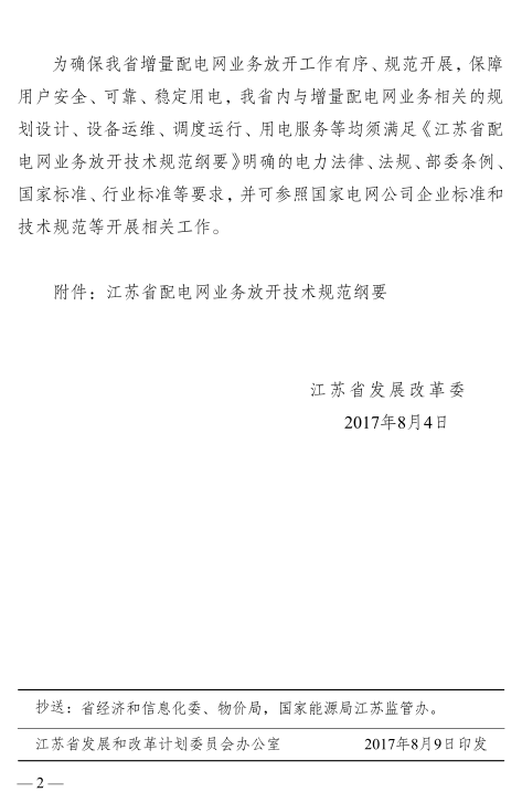 8月份,江蘇省發(fā)改委下發(fā)了《江蘇省增量配電業(yè)務(wù)改革試點(diǎn)實(shí)施細(xì)則》,其中強(qiáng)調(diào)“為保障增量配電網(wǎng)用戶安全、可靠、穩(wěn)定用電,與增量配電業(yè)務(wù)相關(guān)的規(guī)劃、工程設(shè)計(jì)、設(shè)備運(yùn)維、調(diào)度運(yùn)行、客戶服務(wù)、供電安全等方面工作均應(yīng)依據(jù)《江蘇省增量配電業(yè)務(wù)技術(shù)標(biāo)準(zhǔn)體系》(另行編制發(fā)布)等開展。”這是第一個(gè)針對增量配電網(wǎng)提出技術(shù)規(guī)范要求的省級文件。