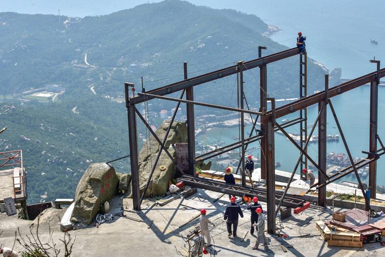 南方電網(wǎng)大萬山島微電網(wǎng)項目安裝3臺630千伏安箱式變壓器現(xiàn)場。山頂上的三臺箱式變壓器都是安裝在懸崖邊上,重型吊裝車輛無法到達,施工人員只得手工搭建了簡易的龍門架,用傳統(tǒng)的方法完成3臺重達5.6噸的箱式變壓器的吊裝。朱甸攝