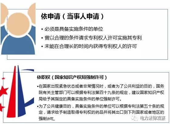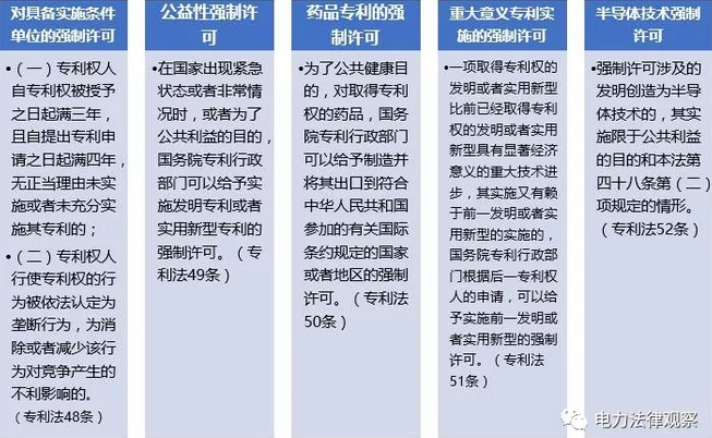 觀茶君腦洞大開之際,對(duì)我國(guó)專利“強(qiáng)制許可”制度的適用情形、范圍、程序進(jìn)行了研究,以探討“強(qiáng)制許可“這一制度理念在增量配電改革中對(duì)電網(wǎng)企業(yè)存量資產(chǎn)處理上的適用借鑒性。