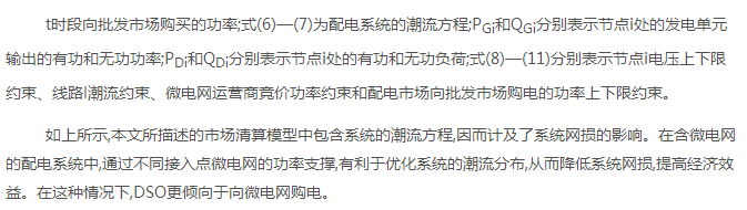上述文獻的主要研究對象集中在輸電側,對配電側市場,尤其是微電網參與下的配電側市場交易和競價機制研究較少。文獻[17-19]雖然考慮了配電市場環(huán)境下微電網的博弈競價,但未考慮配電系統(tǒng)的網架結構和潮流分布對市場競價結果的影響。實際上,在配電網中,系統(tǒng)的節(jié)點電壓和潮流分布(如網損等)將受到不同接入位置的微電網上網電量的影響,系統(tǒng)運營商通過對微電網出力的優(yōu)化,能夠有效降低系統(tǒng)的網損,從而節(jié)約購電成本。在這種情況下,微電網間的博弈不僅取決于報價,還與系統(tǒng)的網架結構、潮流分布以及自身接入位置有關。此外,隨著未來零售市場的開放程度不斷加深,一個零售商可能會投資多個微電網,此時多個微電網之間在博弈層面上是一種聯(lián)盟的形式,追求的是整體利益的最大化。因此,有必要對這種情況下微電網的競價策略和市場的交易進行研究和分析。
