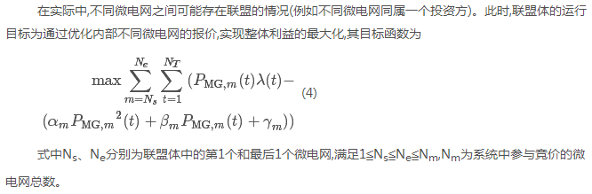 微電網運營商第2日各時段可參與競價的功率范圍取決于自身的負荷預測、可再生能源(如光伏、風機等)出力預測以及可控分布式電源(如微型燃氣輪機等)、可控負荷及儲能等單元的可調度功率范圍,是針對微電網內部各單元優(yōu)化的結果[20]。本文僅考慮各微電網運營商售電的場景,且認為各時段可參與競價的功率范圍已知。