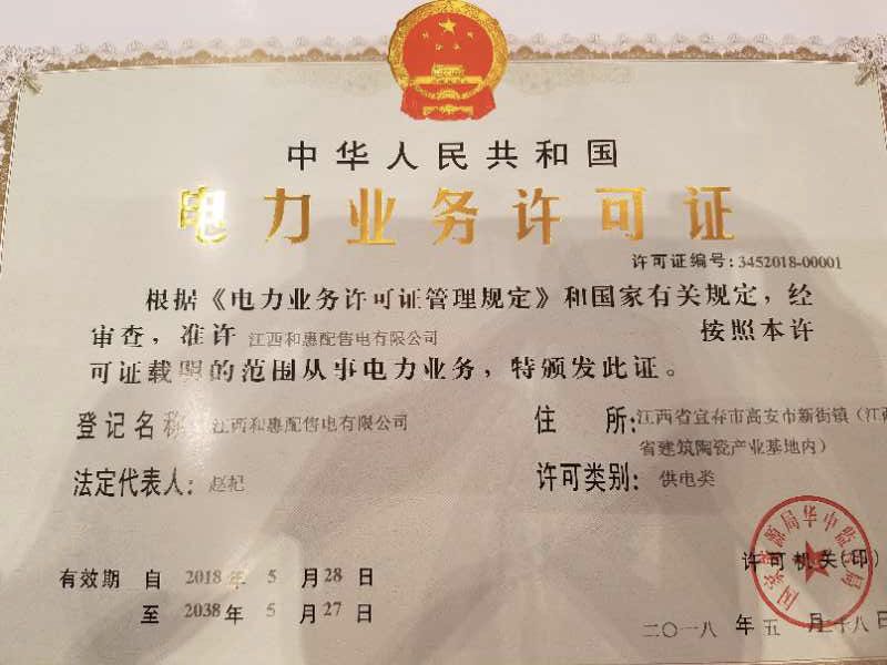 江西和惠配售電有限公司獲得供電類電力業(yè)務(wù)許可證