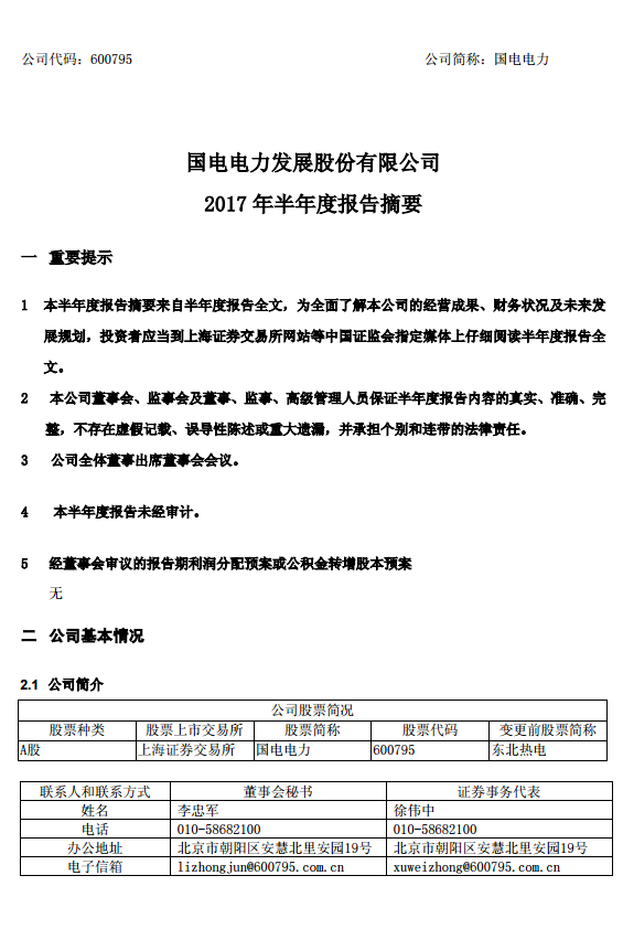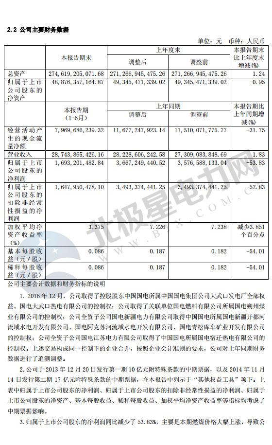 國電電力2017年半年度報(bào)告:凈利潤16.932億元 同比減少53.83%(附報(bào)告)