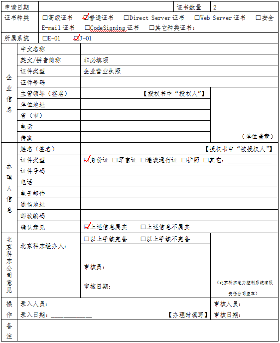 企業(yè)證書(shū)申請(qǐng)表(紅色對(duì)勾部分為默認(rèn),無(wú)需用戶填寫)