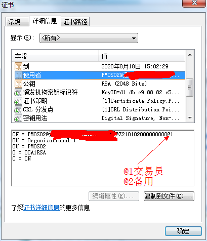 選擇”顯示證書”項(xiàng),然后再選擇”詳細(xì)信息”項(xiàng),在字段下選項(xiàng)里選擇”使用者”或者叫“主題”項(xiàng),CN串尾@1一般為交易員(即主鑰匙),@2為管理員(即備用鑰匙)