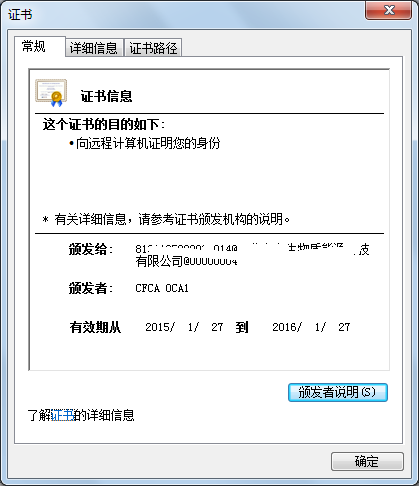 選擇“顯示證書”項(xiàng),您可查看證書的有效期及頒發(fā)者等信息。如圖。