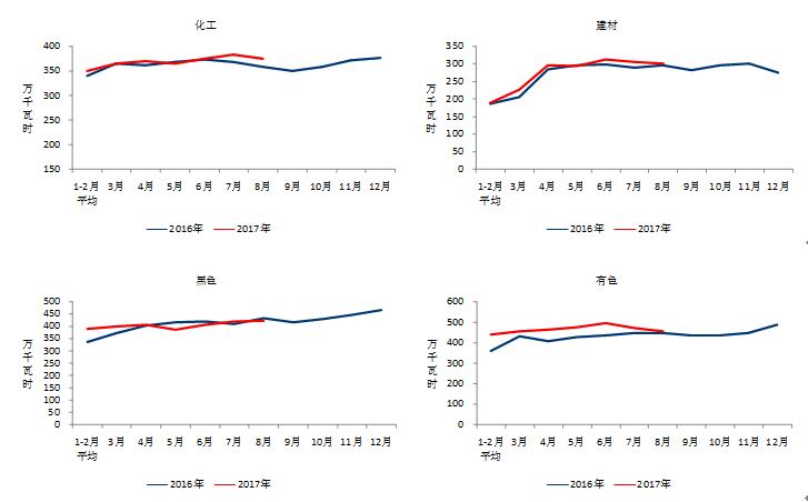 1-8月份,化學(xué)原料制品、非金屬礦物制品、黑色金屬冶煉和有色金屬冶煉四大高載能行業(yè)用電量合計11934億千瓦時,同比增長5.4%,增速比上年同期提高7.6個百分點;合計用電量占全社會用電量的比重為28.7%,對全社會用電量增長的貢獻(xiàn)率為23.0%。其中,化工行業(yè)用電量2930億千瓦時,同比增長3.8%,增速比上年同期提高1.2個百分點;建材行業(yè)用電量2108億千瓦時,同比增長3.7%,增速比上年同期提高3.1個百分點;黑色金屬冶煉行業(yè)用電量3195億千瓦時,同比增長1.8%,增速比上年同期提高9.2個百分點;有色金屬冶煉行業(yè)3701億千瓦時,同比增長11.2%,增速比上年同期提高14.0個百分點。