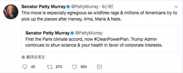 “先是《巴黎協(xié)定》,現(xiàn)在輪到了#清潔電力計(jì)劃,川普一直在為了大公司的利益來回避氣候變化的科學(xué)性和公眾健康問題。在美國各地森林火災(zāi)頻發(fā)以及數(shù)以百萬的美國人遭受著哈維,厄瑪,瑪麗亞還有內(nèi)特等颶風(fēng)氣候?yàn)?zāi)害的時(shí)候,這一舉動(dòng)尤其過分。”
