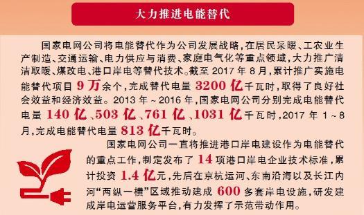 近年來,公司在居民采暖、工農(nóng)業(yè)生產(chǎn)制造、交通運(yùn)輸、電力供應(yīng)與消費(fèi)、家庭電氣化等重點(diǎn)領(lǐng)域,大力推廣清潔取暖、煤改電、港口岸電等替代技術(shù),陸續(xù)建成一大批典型示范項(xiàng)目。截至今年8月底,累計(jì)推廣實(shí)施電能替代項(xiàng)目9萬余個(gè),完成替代電量近3200億千瓦時(shí),推動(dòng)社會(huì)用能與生產(chǎn)生活方式發(fā)生重要變化,取得了良好社會(huì)效益和經(jīng)濟(jì)效益。今年3月,北京電網(wǎng)最后一個(gè)燃煤機(jī)組正式停機(jī),所需電力將通過特高壓等輸電通道輸入,成為全國首個(gè)全部依靠清潔能源發(fā)電的城市,為其他大城市提供了能源清潔化發(fā)展的范本。