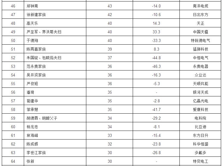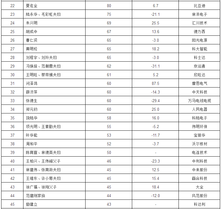 最年輕的為贏(yíng)合科技的王維東、許小菊夫婦,分別為40歲月、37歲。東方鐵塔的韓匯如也只有41歲,欣旺達(dá)的王威、明星電纜的李廣元、金冠電氣的徐海江、東方日升的林海峰均為42歲。
