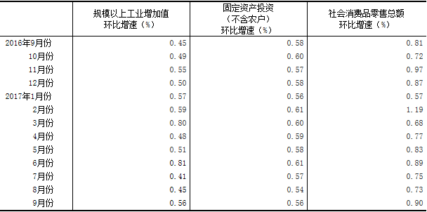(2)根據(jù)季節(jié)調(diào)整模型自動(dòng)修正結(jié)果,對(duì)近一年來(lái)各期國(guó)內(nèi)生產(chǎn)總值、規(guī)模以上工業(yè)增加值、固定資產(chǎn)投資(不含農(nóng)戶)、社會(huì)消費(fèi)品零售總額環(huán)比增速進(jìn)行修訂。修訂結(jié)果及2017年三季度GDP環(huán)比數(shù)據(jù)、2017年9月份其他指標(biāo)環(huán)比數(shù)據(jù)如下: