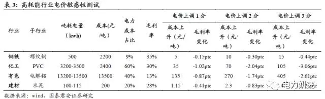 目前時(shí)點(diǎn)高耗能行業(yè)對(duì)電價(jià)承受能力較高。若電價(jià)上調(diào),影響最顯著的將是高耗能行業(yè),我們選擇了幾種具有代表性的高耗能行進(jìn)行測(cè)算,結(jié)果顯示,無論從影響范圍還是從影響程度來看,電價(jià)上調(diào)對(duì)高耗能企業(yè)成本的影響均十分有限。