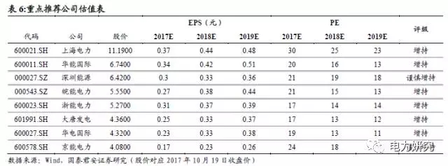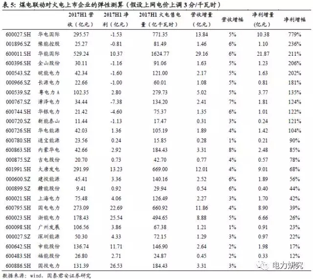 煤電聯(lián)動有望助力火電行業(yè)業(yè)績顯著改善。假設(shè)全國平均電價上調(diào)3分/千瓦時,我們以2017上半年凈利潤為基準,對火電板塊主要上市公司業(yè)績進行彈性測試。結(jié)果表明此次電價上調(diào)有望使得火電企業(yè)業(yè)績環(huán)比顯著改善。五大集團火電上市平臺中,華電國際、華能國際由于火電裝機占比高,從而顯示出較強彈性,彈性高達779%、236%。相比之下,國電電力受影響較小,主要由于可再生能源裝機占比超過三成,業(yè)績受煤電價格關(guān)系改善影響相對有限,在2017H1業(yè)績基礎(chǔ)上彈性僅為39%。此外,地方電力企業(yè)皖能電力和粵電力A上半年業(yè)績下滑都較為嚴重,因而對電價上調(diào)較為敏感,測算彈性分別為202%和135%,其余公司如豫能控股、金山股份、長源電力、漳澤電力、華銀電力、新能泰山等由于凈利潤基數(shù)較小,對電價變動也較為敏感,均表現(xiàn)出較高的凈利潤彈性。