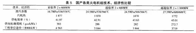 超臨界與超超臨界機(jī)組發(fā)電技術(shù)是目前發(fā)展較成熟、高效、經(jīng)濟(jì)的發(fā)電技術(shù)?;痣姀S超超臨界機(jī)組和超臨界機(jī)組是指鍋爐內(nèi)工質(zhì)(水)的壓力和溫度大于22.129MPa、374.15℃的機(jī)組,爐內(nèi)蒸汽溫度不低于593℃或蒸汽壓力不低于31MPa稱為超超臨界機(jī)組:我國各類火電機(jī)組技術(shù)、經(jīng)濟(jì)性比較如下表5所示。