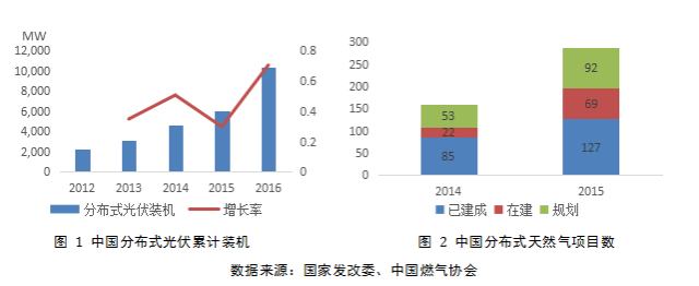 從中國的視角來看,隨著中國經(jīng)濟發(fā)展進入“新常態(tài)”,中國能源行業(yè)發(fā)展的根本目標(biāo)已是天壤之別。過去,中國經(jīng)濟持續(xù)的高速增長導(dǎo)致能源供應(yīng)短缺,那時的時代主線是擴大能源生產(chǎn)以保障供應(yīng);如今,經(jīng)濟發(fā)展放緩,能源供給能力已遠超需求,反而是技術(shù)、環(huán)境、價格、效率等問題制約了進一步發(fā)展,中國能源發(fā)展的問題從數(shù)量問題逐漸轉(zhuǎn)為質(zhì)量問題。短短五年間,中國見證了可再生能源在裝機容量方面的爆發(fā)式增長。然而,嚴重的“棄風(fēng)棄光”問題成為了限制可再生能源進一步發(fā)展的瓶頸。分布式能源的特征符合中國下一階段能源發(fā)展“提質(zhì)增效”的目標(biāo),因此分布式能源在中國也顯現(xiàn)了迅猛崛起的勢頭。分布式光伏累計裝機從2012年時的2.3GW快速上升至2016年底的10.3GW(如圖),年均增長率高達46%;分布式天然氣項目數(shù)(包括建成、在建、規(guī)劃)從2014年時的160個增長至2015年底時的288個。