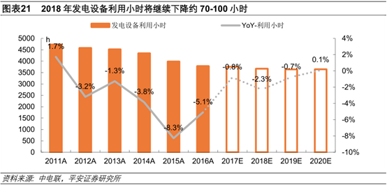 假設(shè)當(dāng)年新增發(fā)電裝機(jī)容量的利用小時(shí)為全年平均利用小時(shí)的一半,根據(jù)計(jì)算結(jié)果,2018年發(fā)電設(shè)備利用小時(shí)將繼續(xù)下降約70-100小時(shí)。