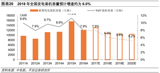 根據(jù)我們對(duì)水電、火電、核電、風(fēng)電、光伏這5種主要電源類型裝機(jī)容量的統(tǒng)計(jì)和測(cè)算,我們預(yù)計(jì)2018年全國(guó)發(fā)電裝機(jī)容量同比增速約為6.0%。