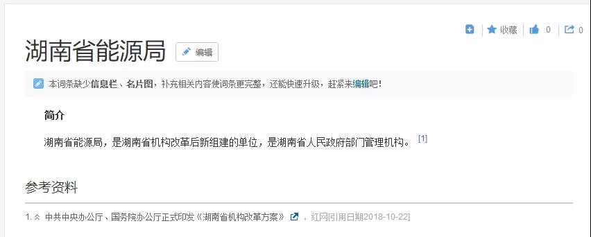 目前,百度百科現也已更新了“廣東省能源局”和“湖南省能源局”的詞條: