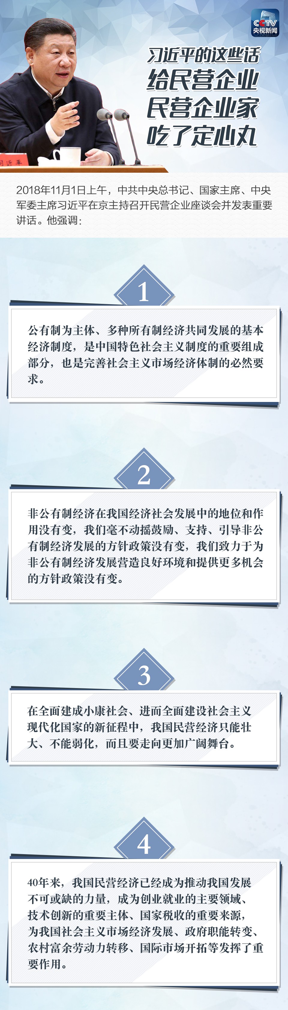 中共中央總書記、國家主席、中央軍委主席習近平11月1日上午在京主持召開民營企業(yè)座談會并發(fā)表重要講話。習總書記對民營經(jīng)濟發(fā)展都作出了哪些重要論述?