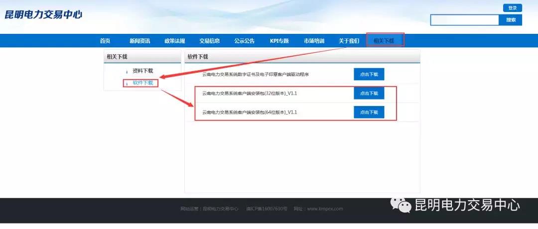 登錄昆明電力交易中心網(wǎng)站(https://www.kmpex.com/),在菜單欄進(jìn)入“相關(guān)下載-軟件下載”模塊,根據(jù)本機(jī)操作系統(tǒng)位數(shù)選擇相應(yīng)版本客戶(hù)端下載。