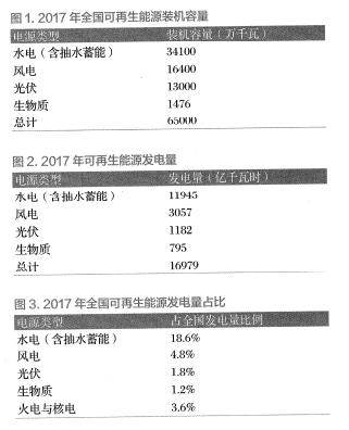 根據(jù)《報(bào)告》統(tǒng)計(jì)數(shù)據(jù),2017年可再生能源發(fā)電量16979億千瓦時(shí),其中水電發(fā)電量為11945億千瓦時(shí),占到可再生能源發(fā)電量的70.40_/{o,非水電可再生能源發(fā)電量只有5025億千瓦時(shí),僅占29.6%。盡管非水可再生能源與水電發(fā)電量相差懸殊,但艤方電力裝機(jī)相差無(wú)幾,截至2017年底,風(fēng)電、光伏、生物質(zhì)發(fā)電裝機(jī)為3.09億千瓦,水電裝機(jī)(含抽水蓄能)3.41億千瓦。