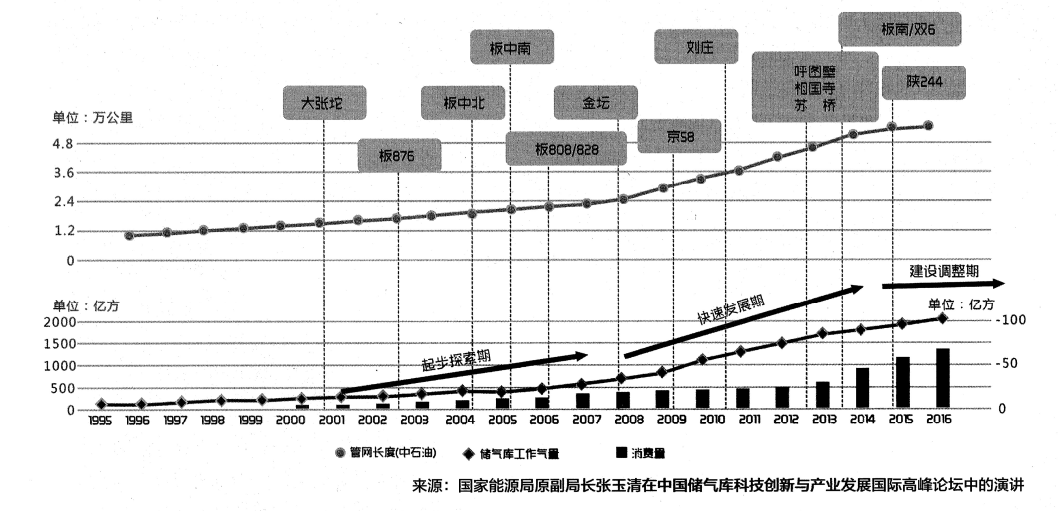 中國(guó)的儲(chǔ)氣調(diào)峰能力建設(shè)啟動(dòng)于1999年,隨著西氣東輸?shù)忍烊粴忾L(zhǎng)輸管道建設(shè)及天然氣工業(yè)發(fā)展而發(fā)展,歷經(jīng)起步探索期和快速發(fā)展初期兩個(gè)階段。中國(guó)首次大規(guī)模采用儲(chǔ)氣庫(kù)調(diào)峰,始于陜京輸氣管道工程。為了解決北京市季節(jié)用氣不均衡的問(wèn)題,保證向北京市穩(wěn)定供氣,1999年,中石油修建了大港油田大張坨地下儲(chǔ)氣庫(kù)。大港儲(chǔ)氣庫(kù)除了向北京供氣以外,還有部分天然氣供應(yīng)天津、河北滄州等地。為保證供氣安全,2001年來(lái),繼大張坨地下儲(chǔ)氣庫(kù)后,中石油又陸續(xù)建成了板876地下儲(chǔ)氣庫(kù)和板中北高點(diǎn)地下儲(chǔ)氣庫(kù)。