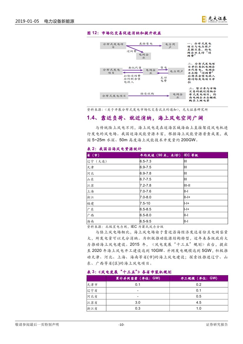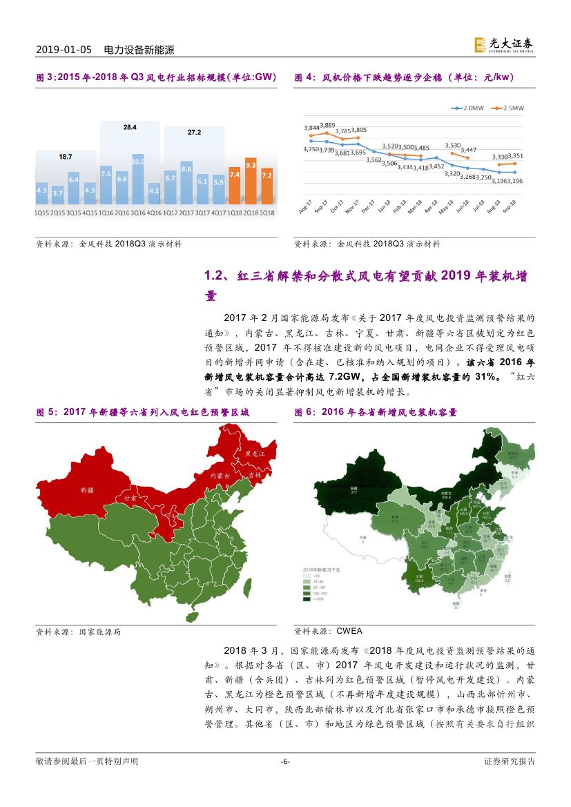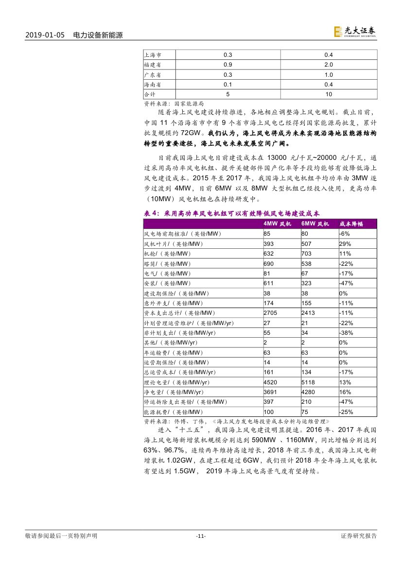 2018 年以來棄風(fēng)率的明顯下降以及 2017、2018 年(截至三季度)兩 年高位的風(fēng)機(jī)招標(biāo)量均指示 2018-2019 年風(fēng)電行業(yè)新增裝機(jī)將迎來大幅反轉(zhuǎn)。紅三省的解禁、分散式風(fēng)電啟動、電價下調(diào)倒逼的搶裝需求以及海上 風(fēng)電的持續(xù)高速增長將助推風(fēng)電裝機(jī)增長,2019 年預(yù)計裝機(jī)將達(dá)到 25-30GW。