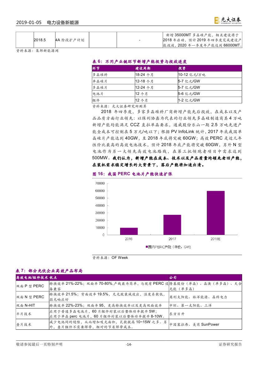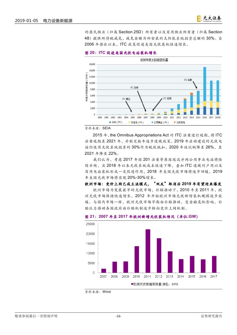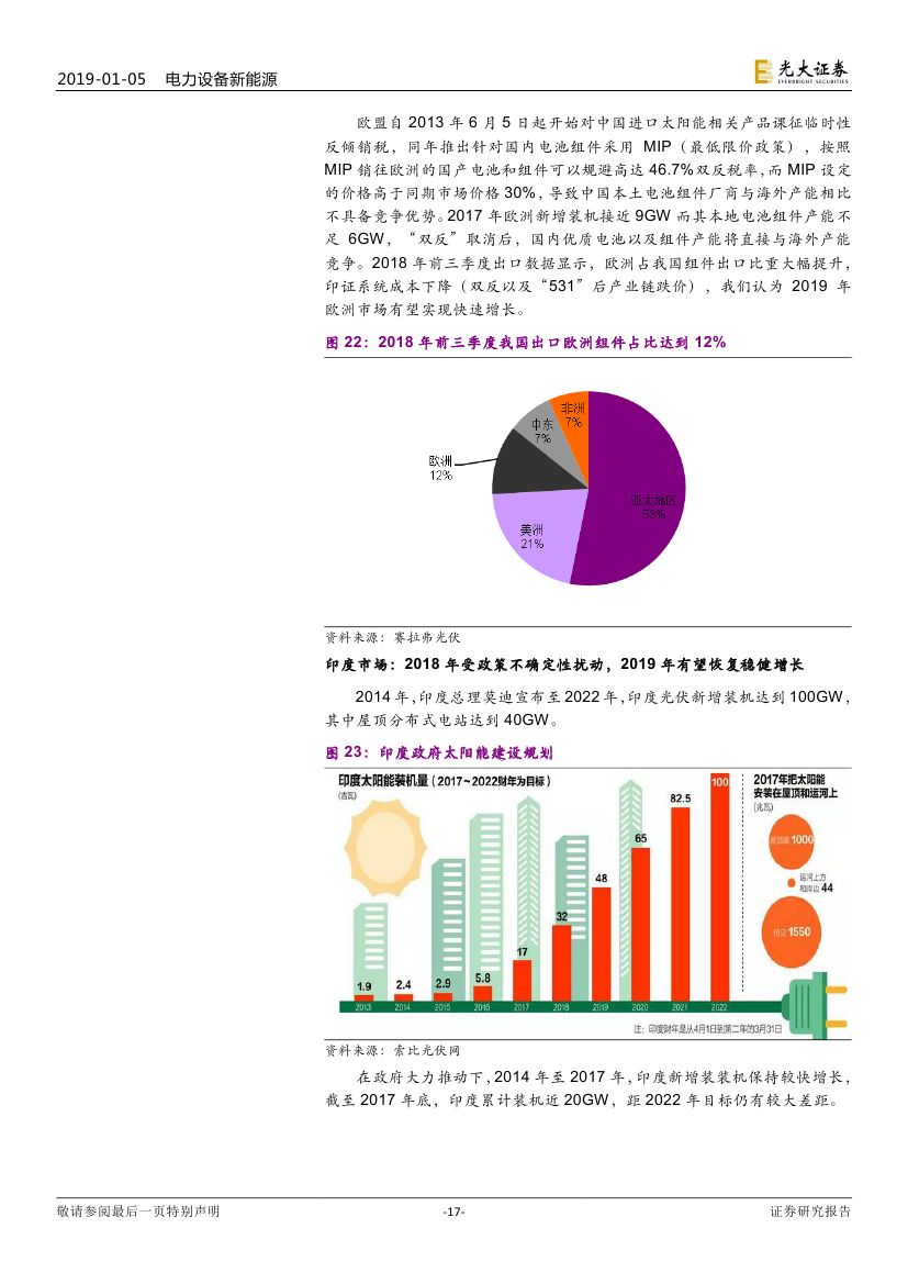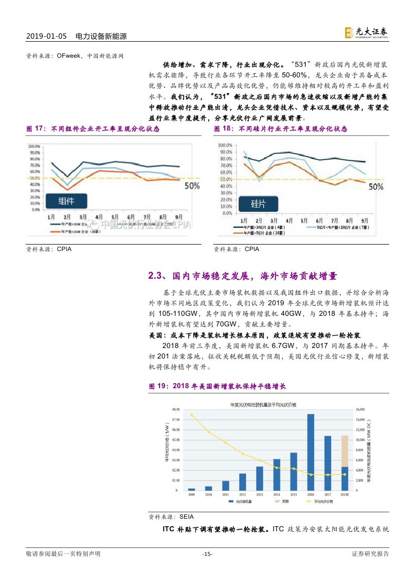2017 年光伏制造行業(yè)大規(guī)模擴(kuò)產(chǎn),新增產(chǎn)能于 2018/2019 年陸續(xù)投 放造成供過于求,具備成本優(yōu)勢和技術(shù)路線優(yōu)勢的企業(yè)將勝出。2019 年 16 個 GW 級光伏市場有望出現(xiàn),海外市場實現(xiàn)持續(xù)快速增長。我們認(rèn)為積 極布局海外市場的企業(yè)將有效規(guī)避單一市場波動帶來的風(fēng)險。