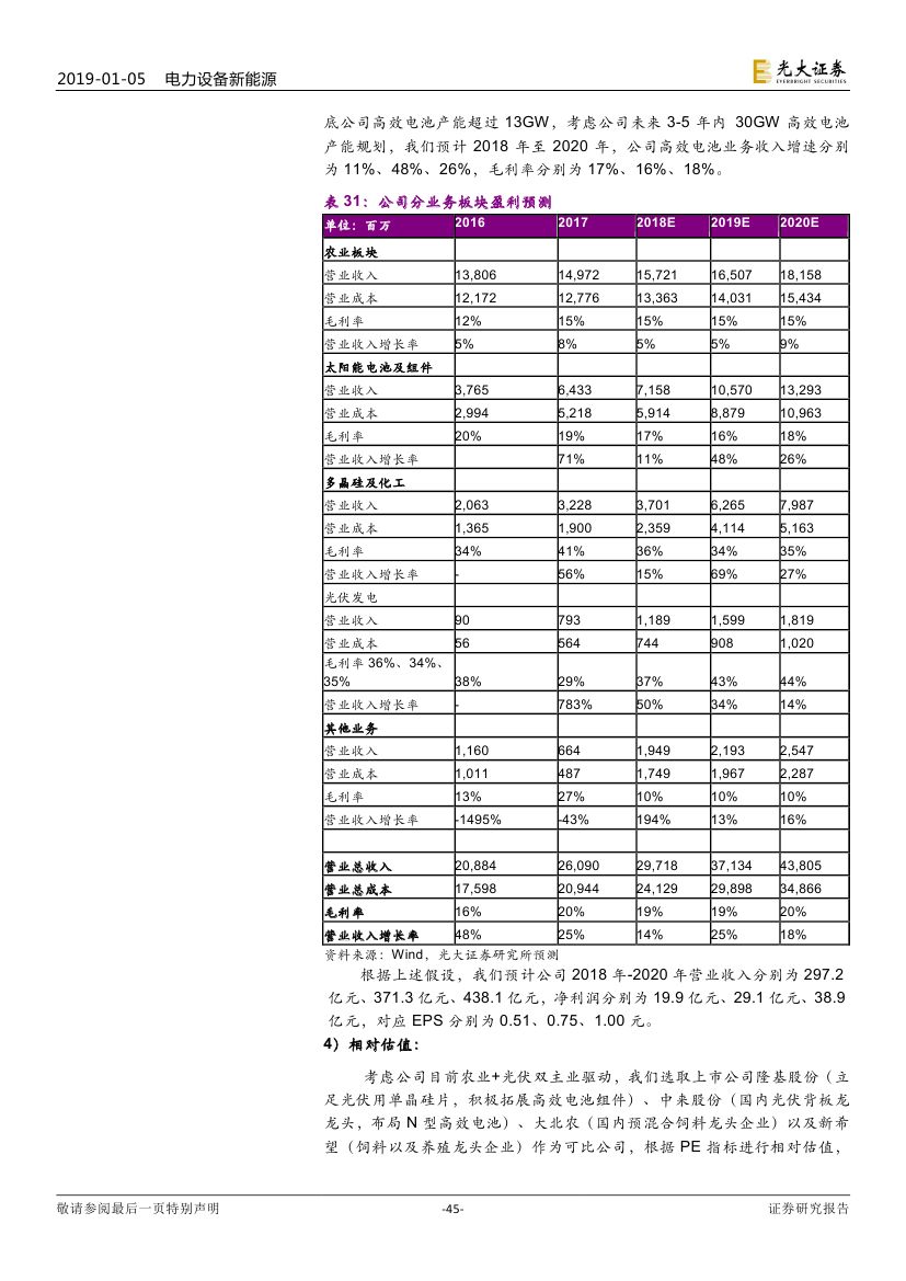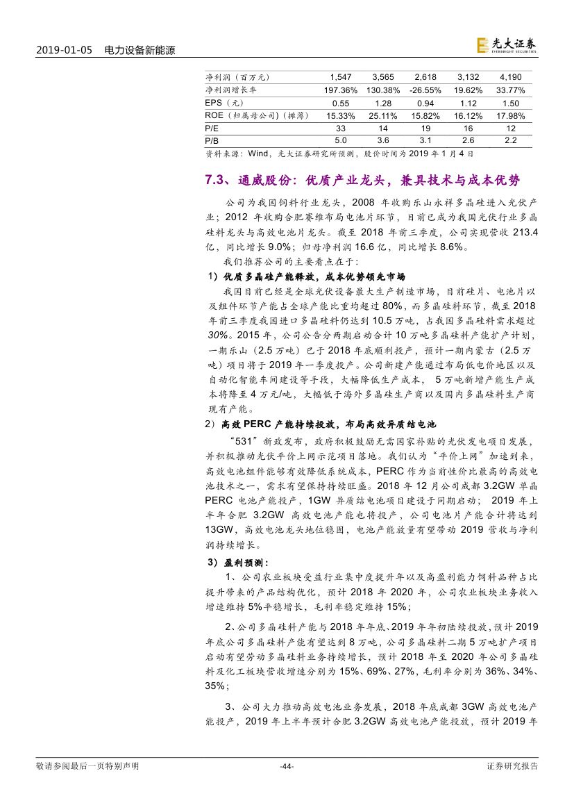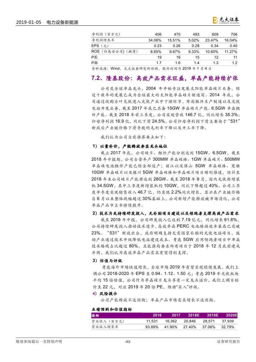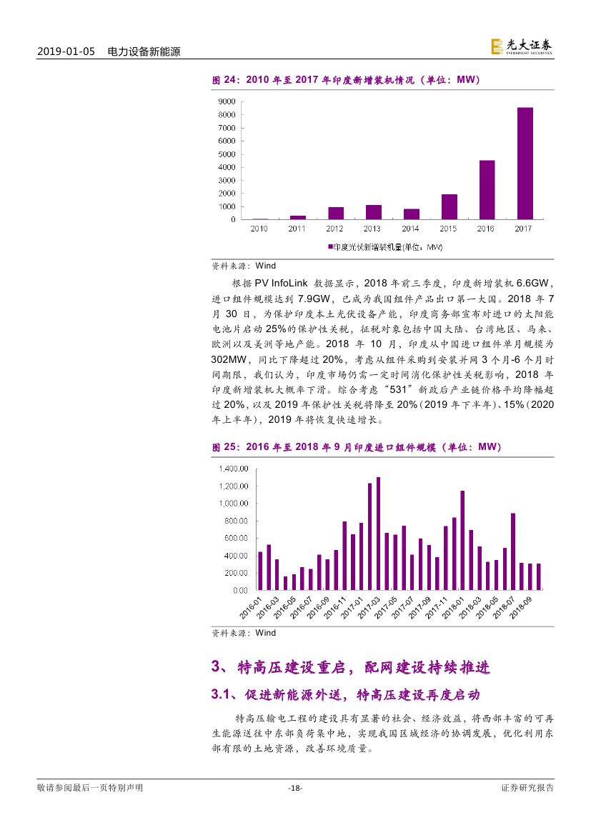 2017 年光伏制造行業(yè)大規(guī)模擴(kuò)產(chǎn),新增產(chǎn)能于 2018/2019 年陸續(xù)投 放造成供過于求,具備成本優(yōu)勢和技術(shù)路線優(yōu)勢的企業(yè)將勝出。2019 年 16 個 GW 級光伏市場有望出現(xiàn),海外市場實現(xiàn)持續(xù)快速增長。我們認(rèn)為積 極布局海外市場的企業(yè)將有效規(guī)避單一市場波動帶來的風(fēng)險。