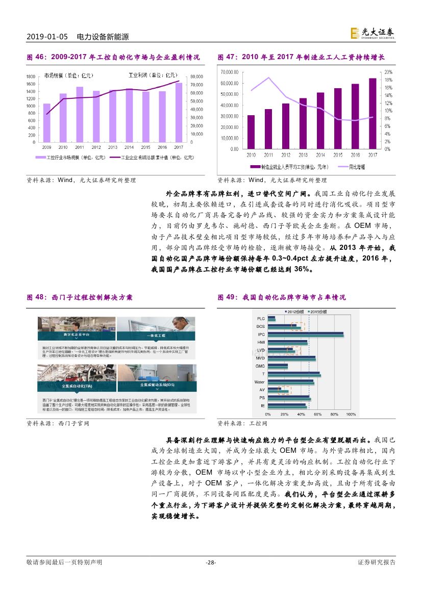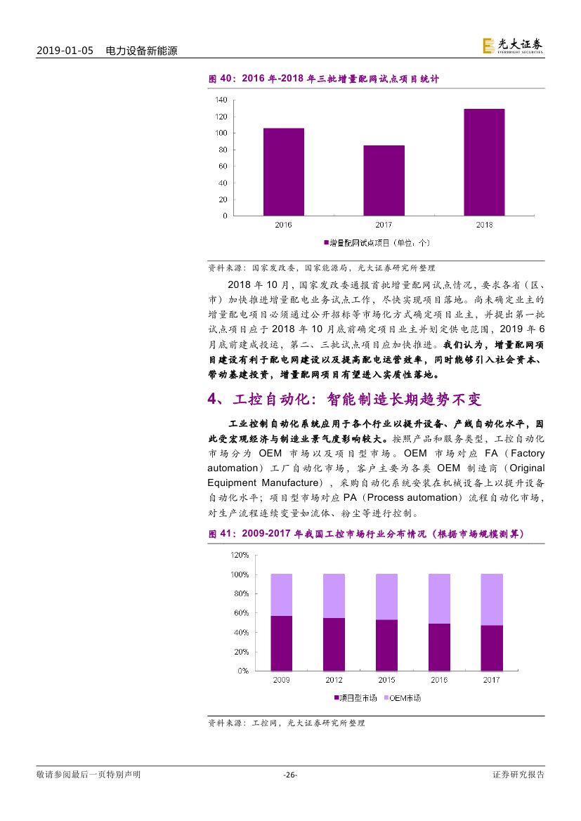 電網(wǎng)建設(shè)持續(xù)推進(jìn),工業(yè)控制自動化長期發(fā)展趨勢確定 2018 年 9 月初,國家能源局下發(fā) 9 項輸變電工程建設(shè)規(guī)劃,涉及 12 條特高壓線路建設(shè),整體拉動電網(wǎng)基建投資約 2000 億;配網(wǎng)建設(shè)改造以 及增量配網(wǎng)試點(diǎn)加速拉動配網(wǎng)設(shè)備需求增長。工控自動化短期受宏觀經(jīng)濟(jì) 以及中美貿(mào)易摩擦影響,長期來看智能制造仍是未來確定性趨勢。我們認(rèn) 為,電力設(shè)備核心設(shè)備供應(yīng)商有望受益特高壓以及配網(wǎng)建設(shè);海外市場拓 展順利的平臺型工控企業(yè)能夠有效降低單一區(qū)域市場以及行業(yè)波動。