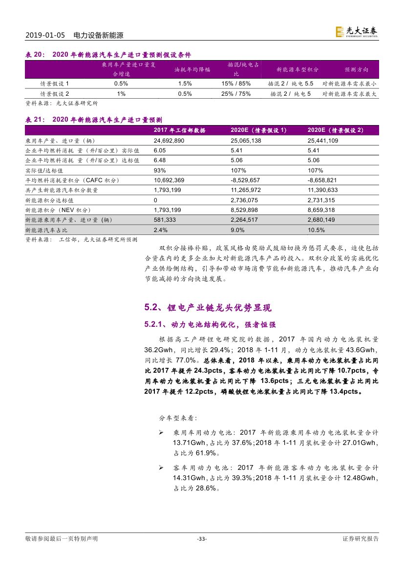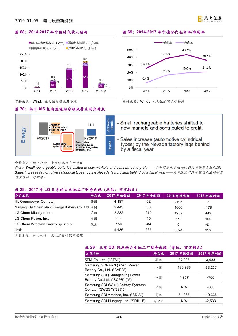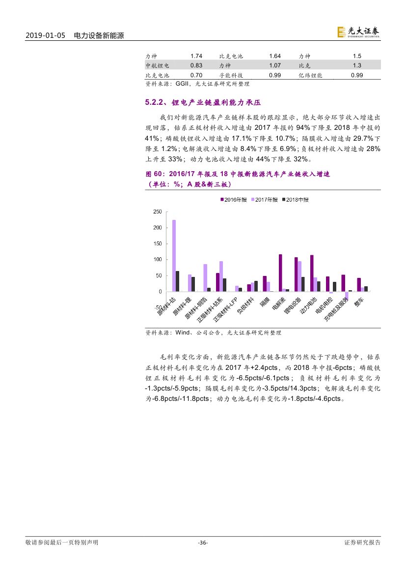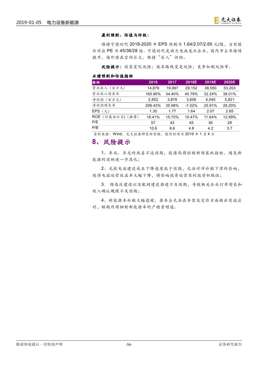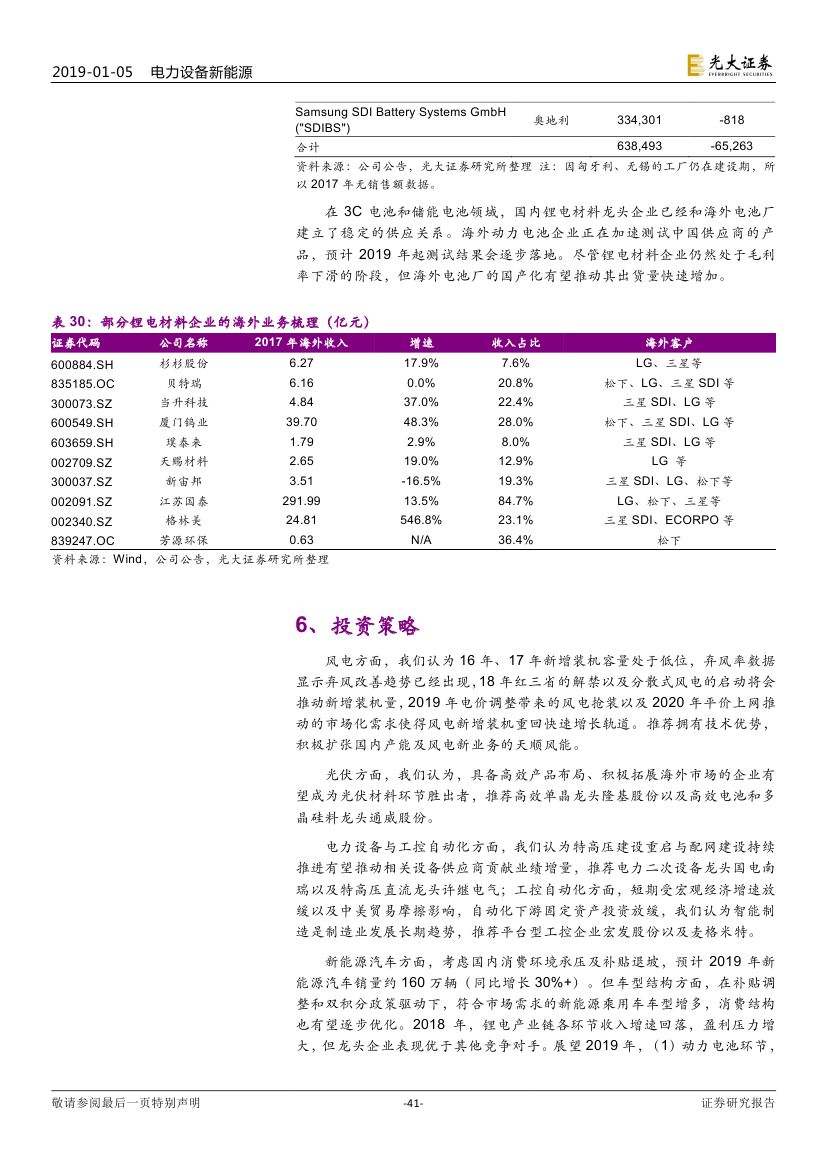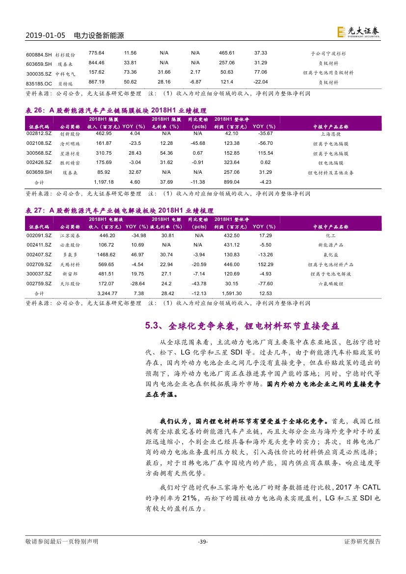 預(yù)計 2019 年新能源汽車銷量約 160 萬輛(同比增長 30%+)。但車 型結(jié)構(gòu)方面,符合市場需求的新能源乘用車車型增多,消費(fèi)結(jié)構(gòu)也有望逐 步優(yōu)化。展望 2019 年,(1)動力電池環(huán)節(jié),成本端的壓力有望緩解,寧 德時代對上下游依然有較大議價能力;(2)鋰電材料環(huán)節(jié),依然面臨價格 下調(diào)的壓力,靜待調(diào)整。我們認(rèn)為,新能源汽車產(chǎn)業(yè)鏈全球化競爭是下一 階段重點(diǎn)關(guān)注的方向。(1)國內(nèi)動力電池龍頭有望憑借性價比優(yōu)勢、服務(wù) 優(yōu)勢出海拿下更多訂單;(2)鋰電材料環(huán)節(jié)也將受益于海外電池廠國產(chǎn)化。