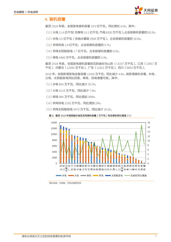 截至2018年底,全國發(fā)電裝機(jī)容量19.0億千瓦,同比增長6.5%。其中:火電11.4億千瓦(含煤電10.1億千瓦、氣電8330萬千瓦),占全部裝機(jī)容量的60.2%;水電3.5億千瓦(含抽水蓄能2999萬千瓦),占全部裝機(jī)容量的18.5%;并網(wǎng)風(fēng)電1.8億千瓦,占全部裝機(jī)容量的9.7%;并網(wǎng)太陽能發(fā)電1.7億千瓦,占全部裝機(jī)容量的9.2%;核電4466萬千瓦,占全部裝機(jī)容量的2.4%。