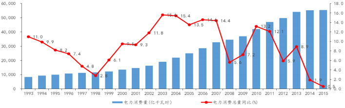 在能源消費(fèi)中,電能是清潔、高效、便利的終端能源載體,提高電能占終端能源消費(fèi)比例已成為世界各國的普遍選擇。過去數(shù)十年,中國的電力需求持續(xù)增長,電能在中國終端能源消費(fèi)中的比重穩(wěn)步提高。但隨著全社會(huì)用電量在2011年后持續(xù)增速下降,用電需求已經(jīng)進(jìn)入低速增長階段,2015年全社會(huì)用電量更是只同比增長0.5%,是中國過去四十年電力同比增長數(shù)據(jù)最低的一年。但進(jìn)入2016年,在經(jīng)濟(jì)政策持續(xù)刺激以及夏天高溫天氣情況下,全社會(huì)用電量出現(xiàn)了反彈,1-9月份全社會(huì)用電量都維持在2%左右或以上,其中三季度同比增幅在7-9%之間,前11月全社會(huì)用電量同比增長4.96%,預(yù)計(jì)全年全社會(huì)用電量或?qū)⒃?%左右。但展望明后年,預(yù)計(jì)全社會(huì)用電量仍將維持低速增長,3-4%區(qū)間的穩(wěn)定增長或是常態(tài)。