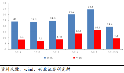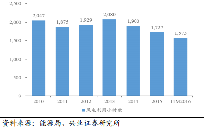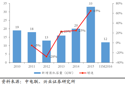 根據(jù)國家能源統(tǒng)計(jì)數(shù)據(jù),2015年中國風(fēng)電新增裝機(jī)量達(dá)到33GW,為歷史最高,但2016年前11個(gè)月完成風(fēng)電并網(wǎng)容量為12GW,同比明顯下降,預(yù)計(jì)2016年全年并網(wǎng)容量在22GW左右。風(fēng)電新增裝機(jī)回落主要原因是在2015年由于電價(jià)下調(diào)政策刺激風(fēng)電行業(yè)出現(xiàn)明顯的搶裝,而2016年風(fēng)電行業(yè)新增建設(shè)規(guī)模則趨于理性。