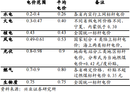 表3、我國發(fā)電種類的上網(wǎng)電價(jià)(元/千瓦時(shí))