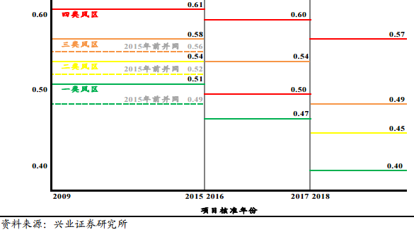 風(fēng)電有望成為最早實(shí)現(xiàn)平價(jià)上網(wǎng)的新能源。2015年10月29日,發(fā)改委發(fā)布了《關(guān)于陸上風(fēng)電光伏發(fā)電上網(wǎng)標(biāo)桿電價(jià)政策的通知》(討論稿),明確從2016年至2020年,逐年下調(diào)陸上風(fēng)電、光伏發(fā)電上網(wǎng)標(biāo)桿電價(jià),以達(dá)到“到2020年風(fēng)電發(fā)電與煤電上網(wǎng)電價(jià)相當(dāng)、光伏發(fā)電與電網(wǎng)銷售電價(jià)相當(dāng)”的目標(biāo)。發(fā)改委于2016年12月24日發(fā)布的《關(guān)于完善陸上風(fēng)電光伏發(fā)電上網(wǎng)標(biāo)桿電價(jià)政策的通知》,Ⅰ-Ⅳ類資源區(qū)2018年以后核準(zhǔn)的風(fēng)電項(xiàng)目上網(wǎng)標(biāo)桿電價(jià)分別降為0.4、0.45、0.49以及0.57元,已經(jīng)非常接近甚至低于國內(nèi)很多地區(qū)的火電標(biāo)桿電價(jià),距離政府提出的2020年實(shí)現(xiàn)平價(jià)上網(wǎng)又邁出較大一步。若考慮2019-2020年的可能繼續(xù)下調(diào)電價(jià),我們預(yù)計(jì)2020年將實(shí)現(xiàn)除4類區(qū)以外的全部地區(qū)平價(jià)上網(wǎng)目標(biāo)。