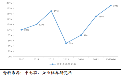 風(fēng)電行業(yè)持續(xù)的高速增長,加之三北地區(qū)外送電力通道建設(shè)滯后,疊加全社會(huì)用電量增長放緩,使得棄風(fēng)限電率近四年來明顯上升。國家能源局?jǐn)?shù)據(jù)顯示,2016年上半年,我國風(fēng)電限電現(xiàn)象持續(xù)加重,風(fēng)電棄風(fēng)電量達(dá)到323億千瓦時(shí)(相當(dāng)于同期北京市居民生活用電量的4倍),同比增加148億千瓦時(shí),限電比例進(jìn)一步增加至21%,同比上升6個(gè)百分點(diǎn);而前三季度風(fēng)電總棄風(fēng)電量394.7億千瓦時(shí),同比增加247億千瓦時(shí);平均棄風(fēng)率19%,同比上升9.5個(gè)百分點(diǎn),但環(huán)比上半年下降2個(gè)百分點(diǎn),主要是保障收購政策逐步落實(shí)拉低了限電率。一般假設(shè)下,風(fēng)電運(yùn)營業(yè)務(wù)固定成本比例較高,因?yàn)轱L(fēng)電的固定資產(chǎn)折舊和融資成本是風(fēng)電最大利潤表開支項(xiàng),如果風(fēng)電廠限電率超過30%,企業(yè)就可能進(jìn)入虧損運(yùn)營狀態(tài)。
